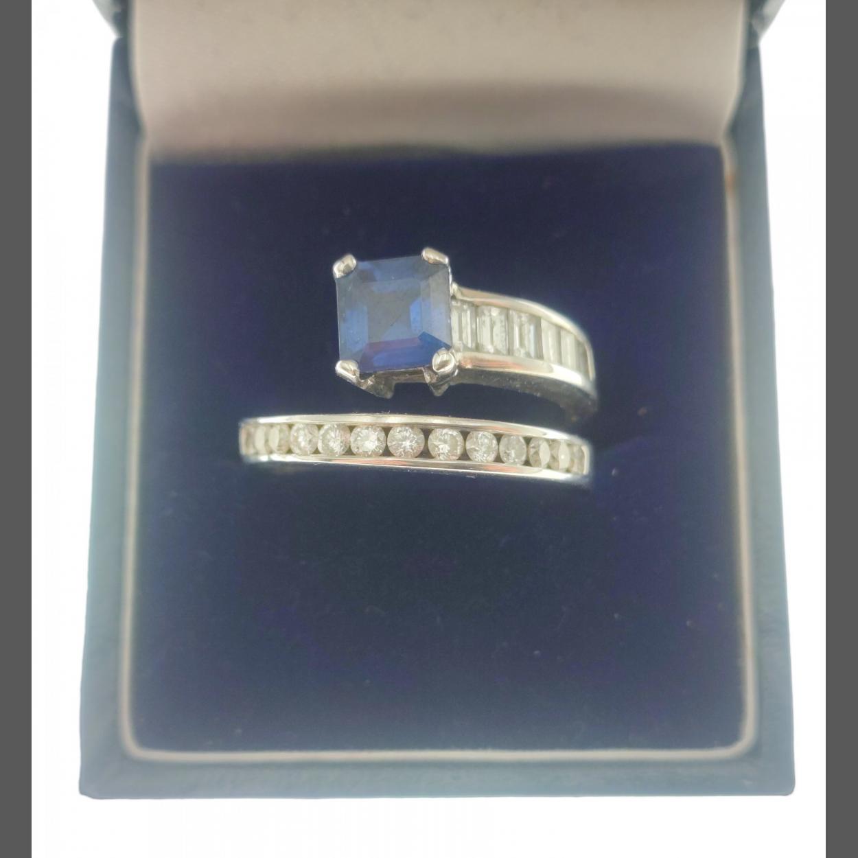 A SUBSTANTIAL 14k stamped ring with SAPPHIRE 0.7ct approx with supporting 19 DIAMONDS (tested) ring - gross weight 7.83g approx - ring size Q