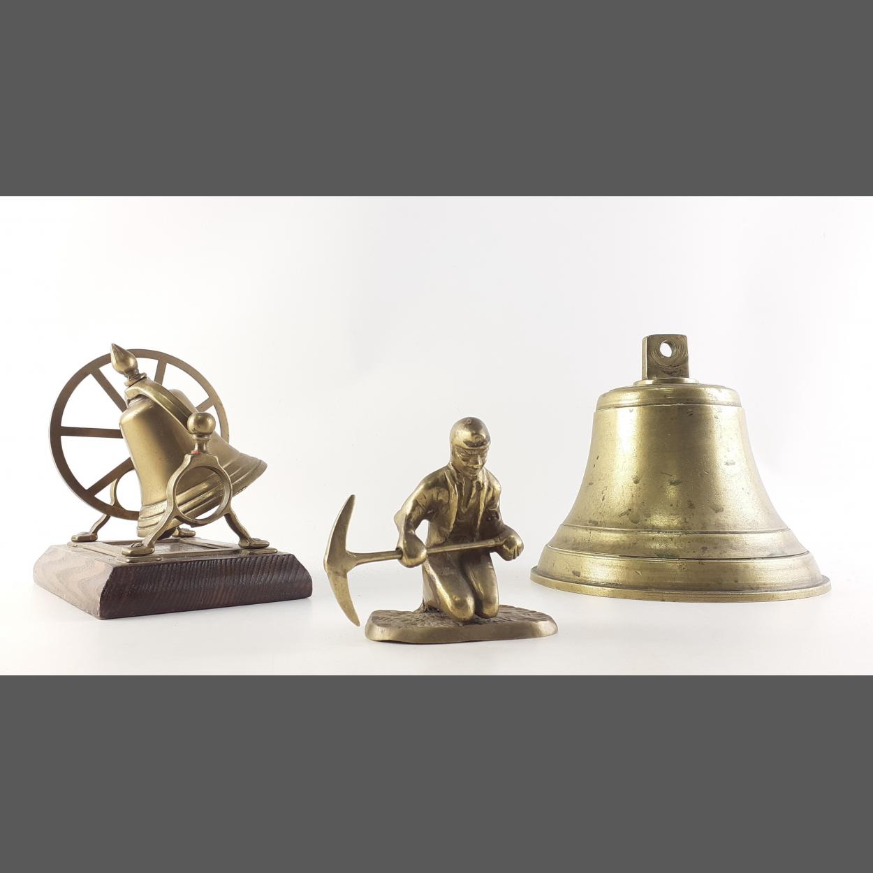 A hand bell on stand, a larger bell with no clapper and a small brass coal miner model.