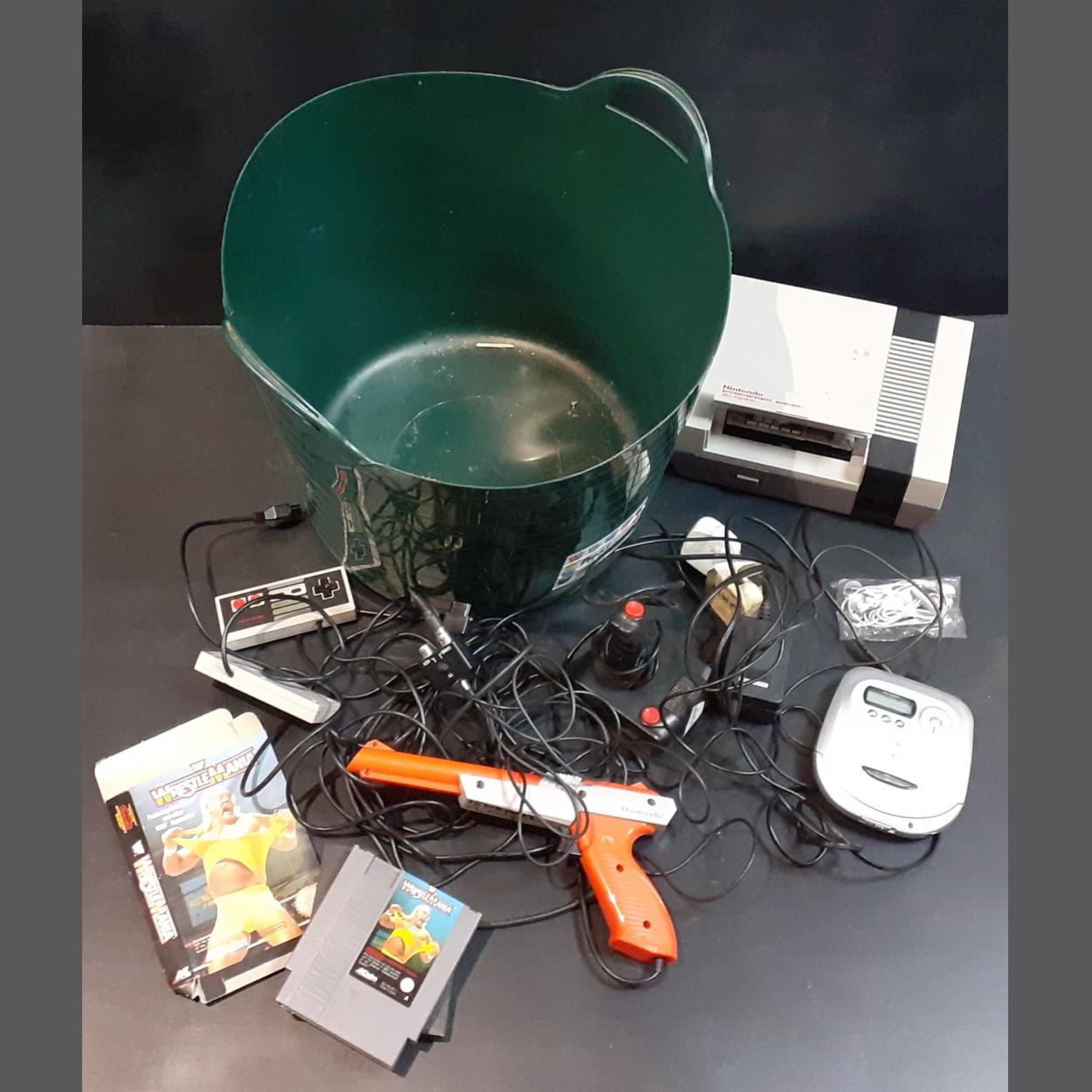 NINTENDO NES system with controllers, cables, gun, Mario Bros / Duck Hunt and WWF.