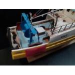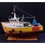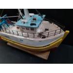 Handmade Wooden fishing trawler apon a plinth GN11 Sapphire . Lovingly handbuilt by a Gent from Port Seton, likely modelled on ships in the harbour. Measures 76cm long.
