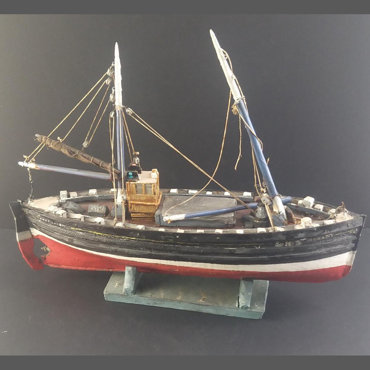 A smaller handbuilt nicely detailed wooden trawler on plinth. MONAMI Measures 45cm long.