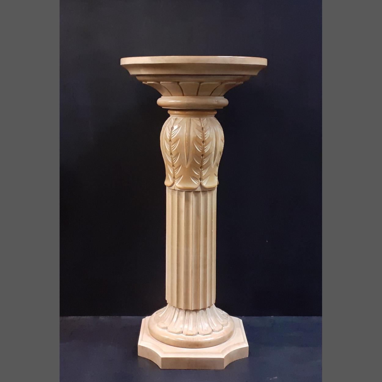 A wooden carved planter stand in light wood. Stylish and practical. Stands 64cm tall
