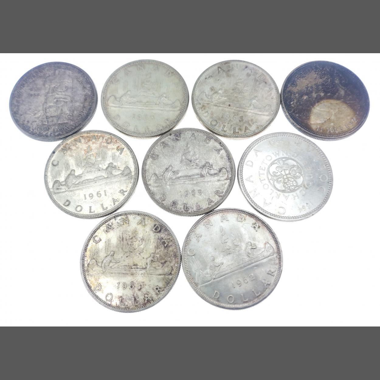 A collection of Nine assorted years CANADA DOLLAR coins. Various years but all 0.800 Silver content. Gross weight 210g approx