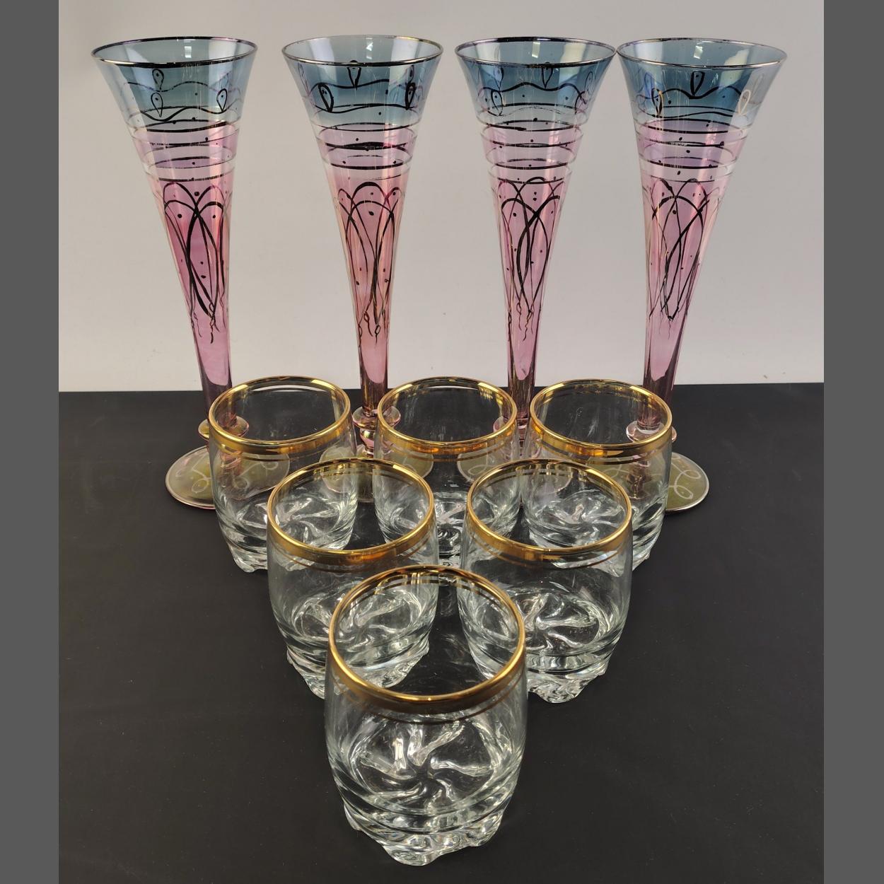 Four stylish tall Ventetian style Champagne Flutes with gilt finish. Also six stylish whisky tumblers.
