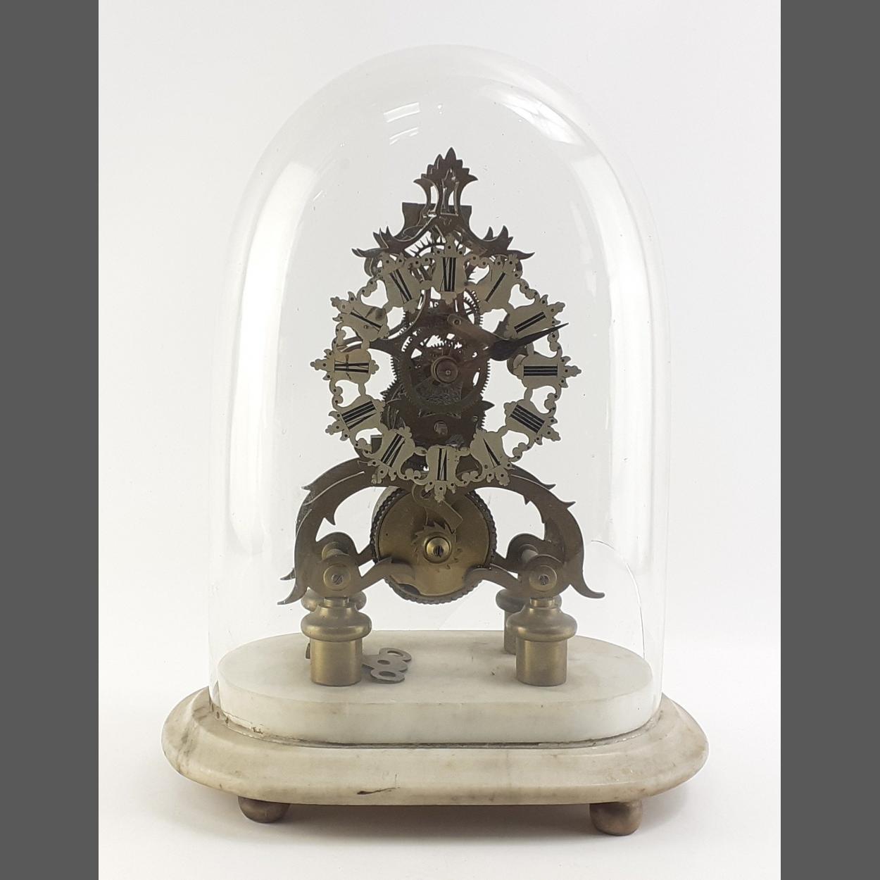 An unsigned SUPERB antique brass skeleton mantle clock with pendulum in glass dome complete with marble base. A very appealling timepiece but the bottom corner of the glass dome is broken/missing. Stands 36cm to top of dome. Clock untested.