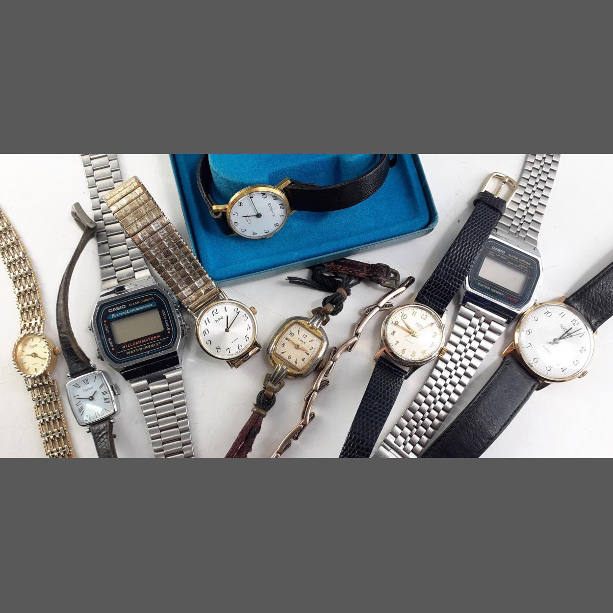 WATCHES. A gents SEKONDA working, A Smiths Ladies working, A EVERITE boxe ladies working two vintage CASIO Digitals may require batteries and various others including a 9ct stamped small expanding part bracelet.