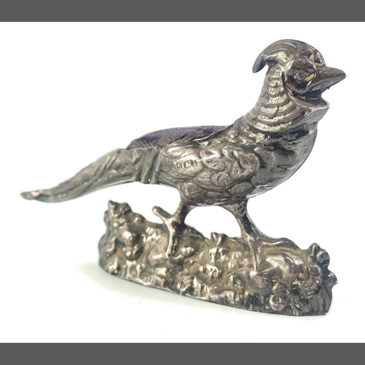 A STERLING SILVER Pheasant shaped pin cushion. 9cm and weighs 30g a very pretty wee chap, Birmingham hallmarks but indistinct date.