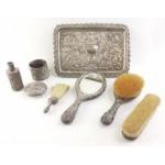 A seven piece STERLING SILVER Dressing table set Comprising tray (315g), Powder jar (158g), three brushes and a silver backed mirror. and one other scent bottle missing stopper. Over 500g in Silver !