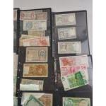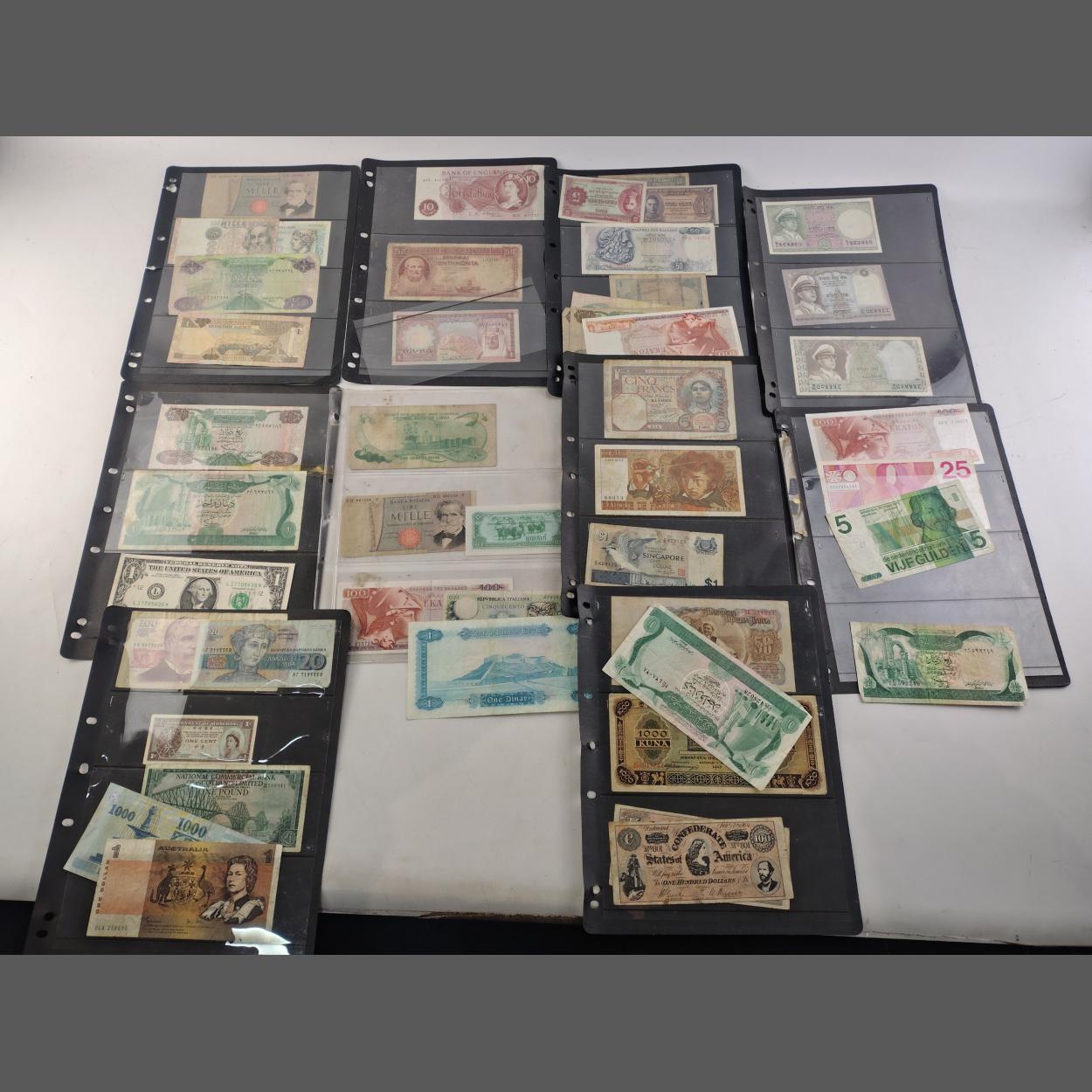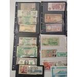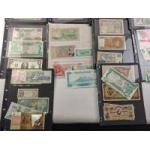 A small collection of World Banknotes on older stock book pages. Middle East , Far East WWII notes, dollars and much else.