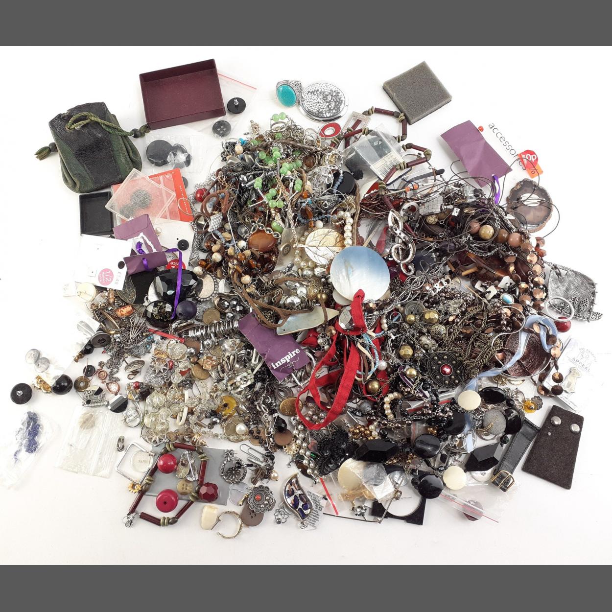 A good selection of bijouterie and dress jewellery. Broockhes, buttons, necklaces and other chains, earrings, rings and much else of interest.