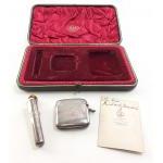A cased STERLING SILVER presentation set from WILSON & SHARP of Edinburgh. Contains a cheroot holder and a vesta case each with 1900 / 1901 hallmarks. Sadly missing the cigarette case. With a CDV photo of the original owner. combined weight of the two pieces 70g.