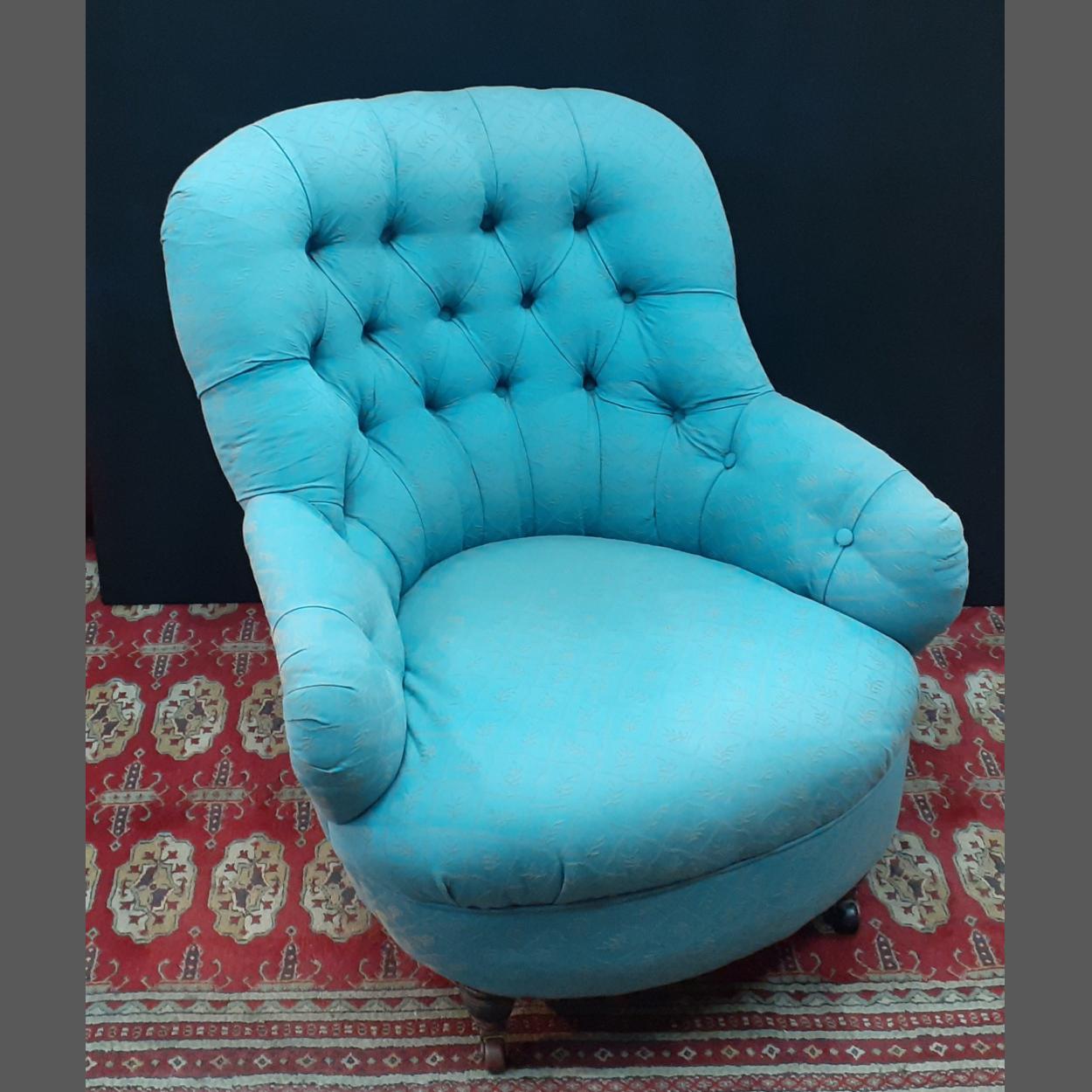 A DELIGHTFUL VICTORIAN deep buttoned Nursing chair which has been recently recovered in a blue fabric - it has its original castors still in place!