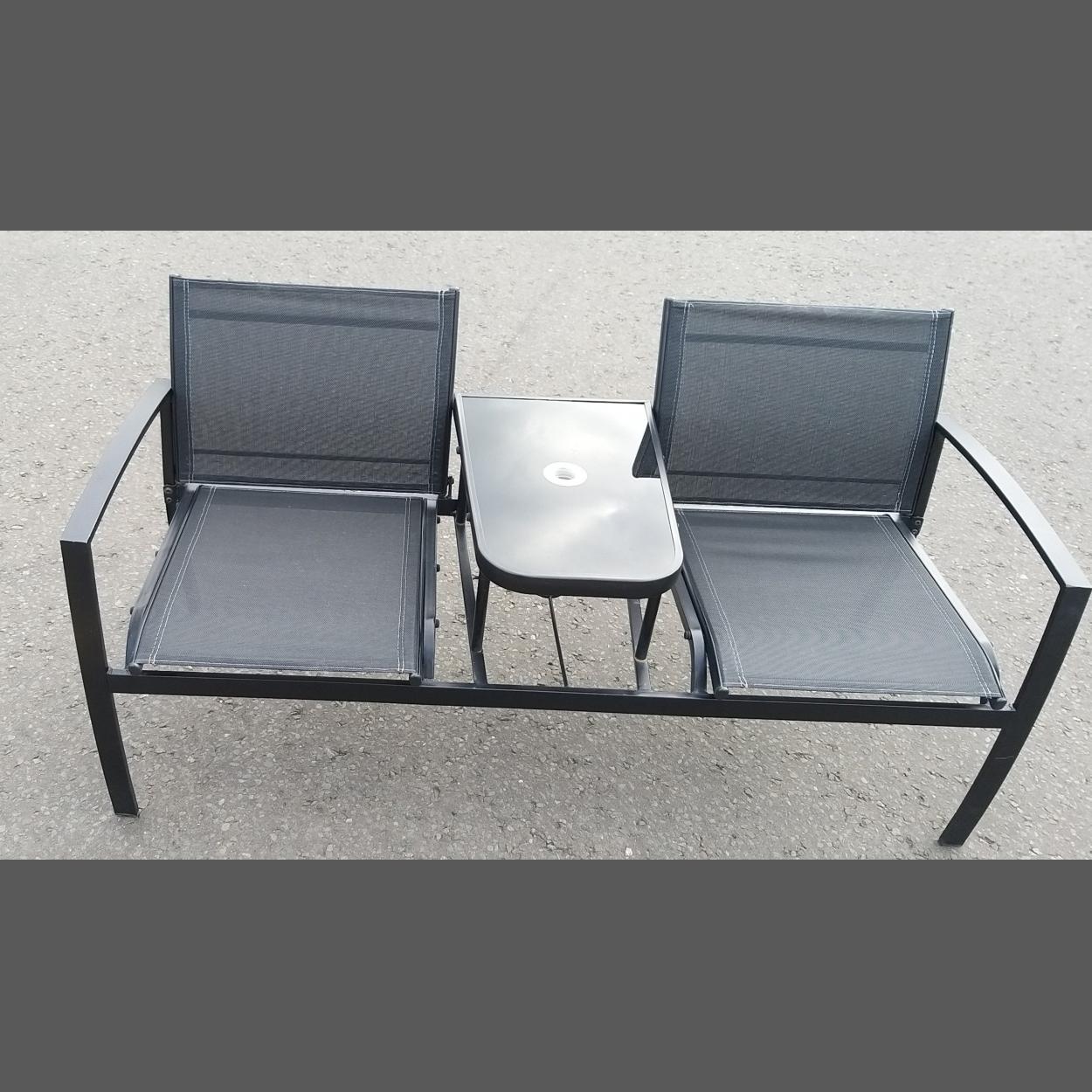 A good condition black metal 2 seater garden bench love seat 145cm wide