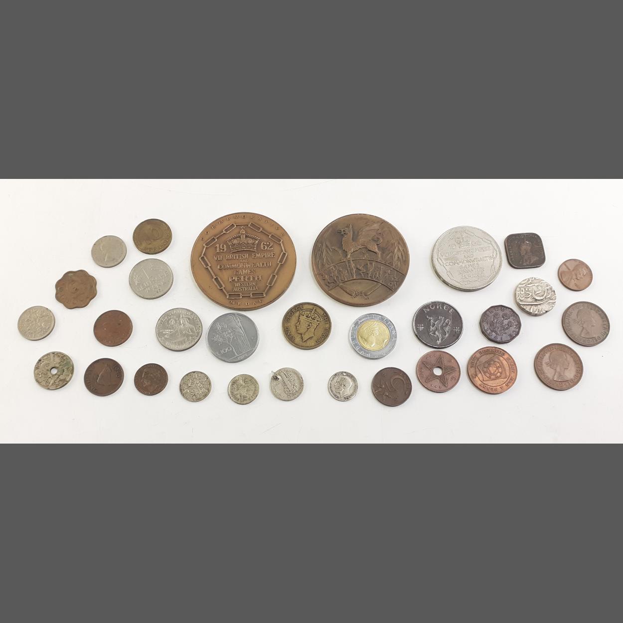 COINS. assorted world coins. To include Leith masonic token, two OLYMPIC GAMES large medallions, two small silver coins noted.