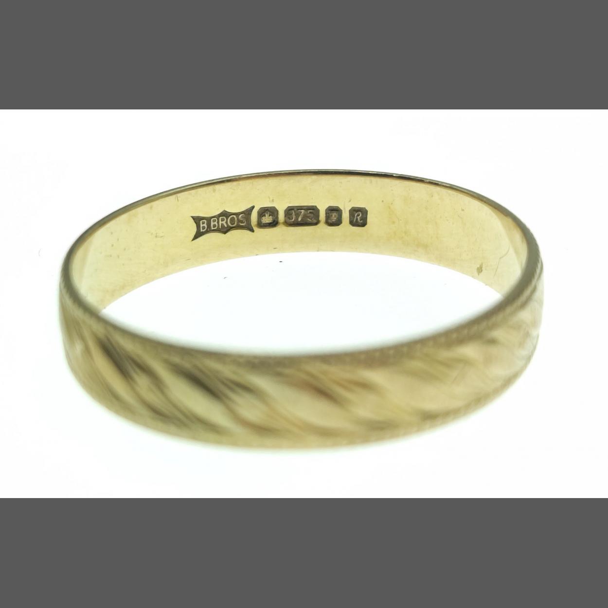 A 9ct wedding band with bright cut engraving. Size O, weight 1.3g