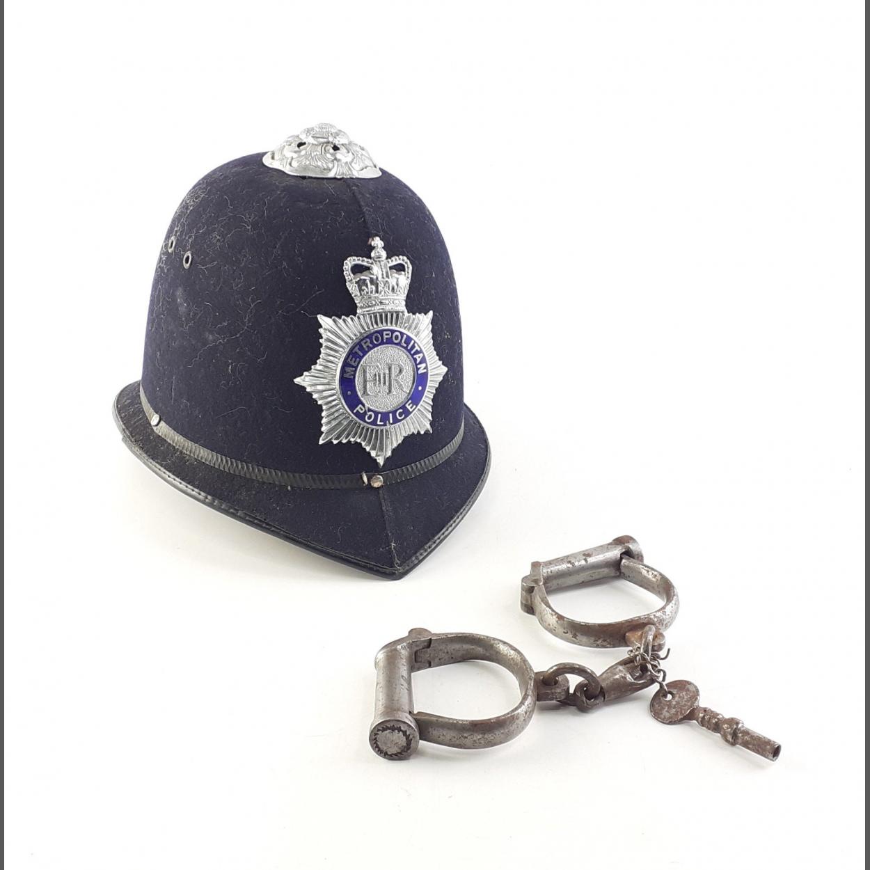 Metrolian Police Helmet size 57 and a pair of antique HIATT handcuffs.