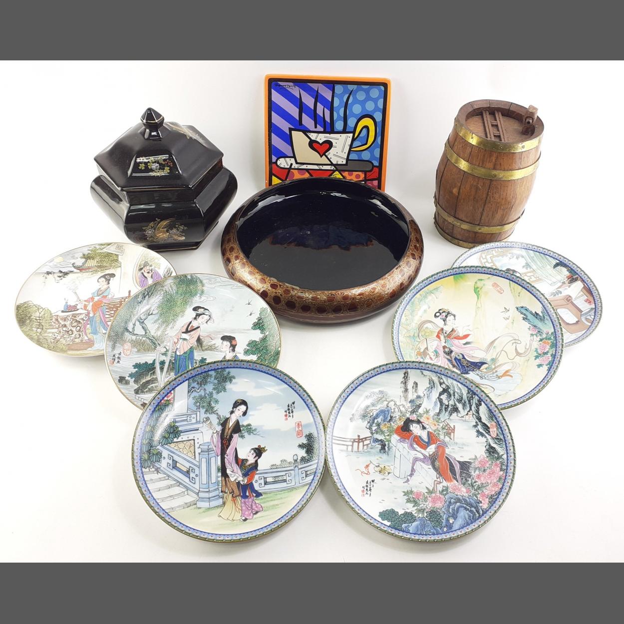 Mixed decorative lot, six oriental theme collectors plates, papier mache bowl, wooden barrel, decorative dish and others.