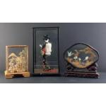 Three oriental diorama ornaments in cases including Geisha. three attractive pieces.