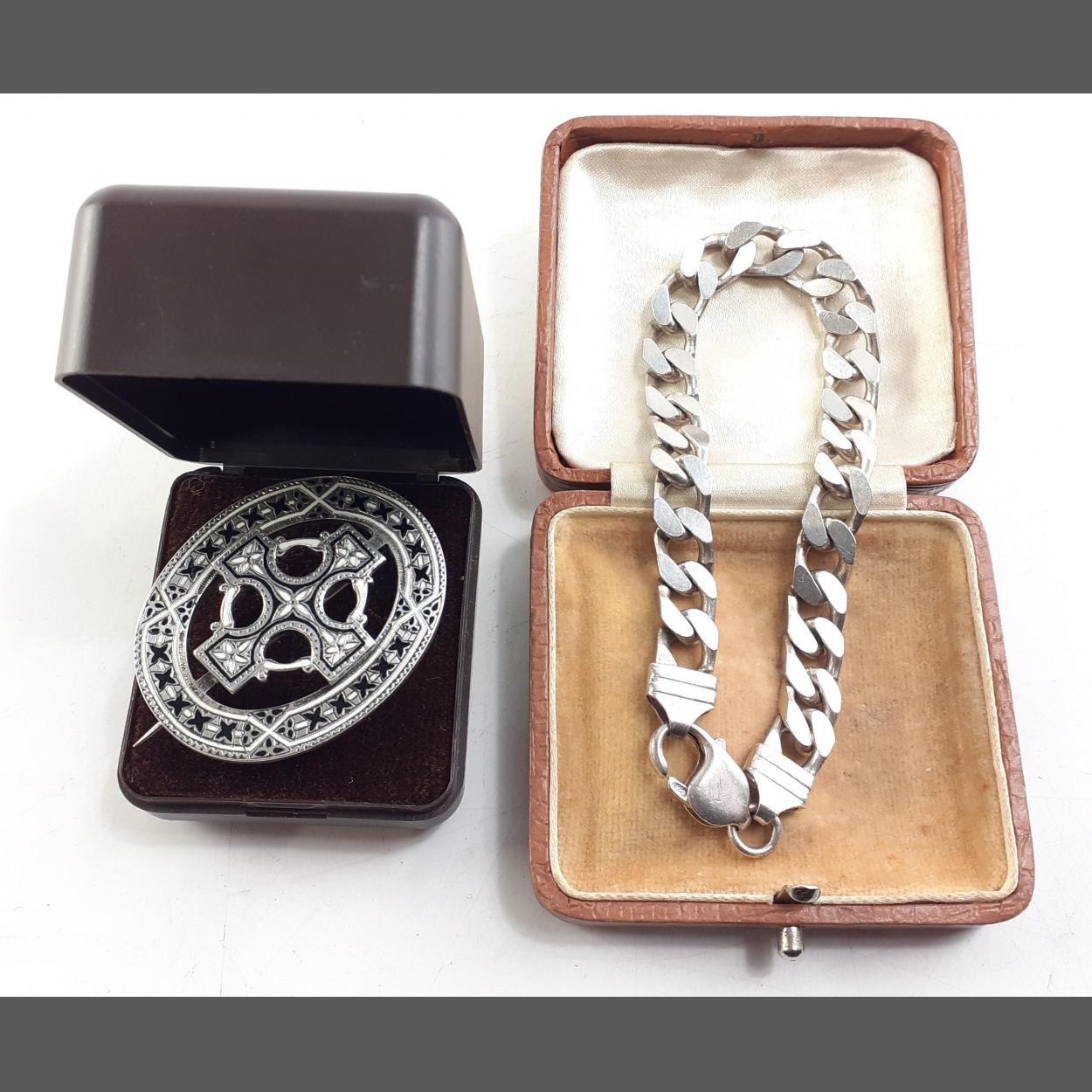 A STERLING SILVER curb bracelet. 20cm approx. Weight 25g approx. Also a lovely enamel unmarked brooch.