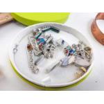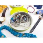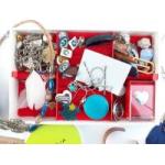 A great bijouterie lot consisting of beads, pins, badges, earrings, some crown coins and other jewellery with an oriental boxed fan. An interesting lot.
