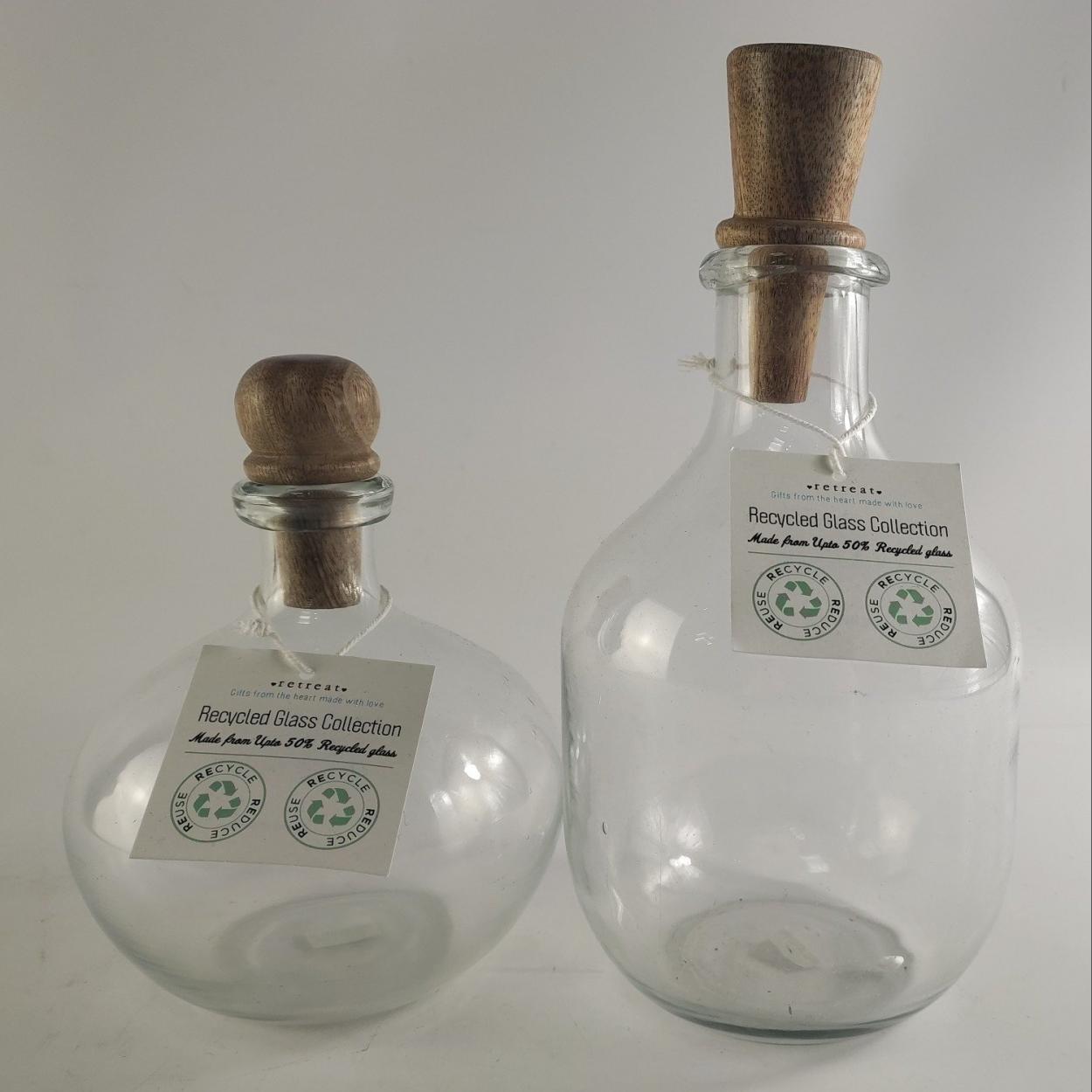XMAS GIFTING IDEAS! Two recycled glass bottles, larger 25cm tall. Ideal for bath salts. All brand new items!