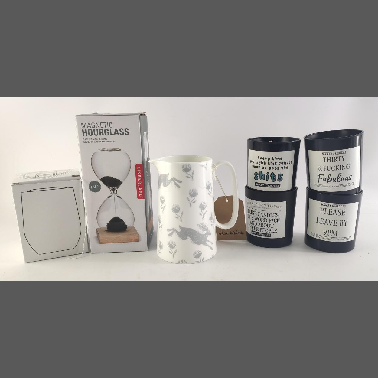 XMAS GIFTING IDEAS! A KIKKERLAND magnetic 1 minute hourglass plus a March hare jug, a thermal tumbler and 4 novelty candles. All brand new items!