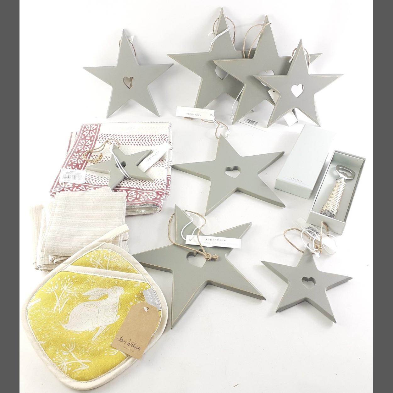 A box of CHRISTMAS gifts to include wooden grey decorative stars, pot grab, place mats, bottle opener. All brand new items!