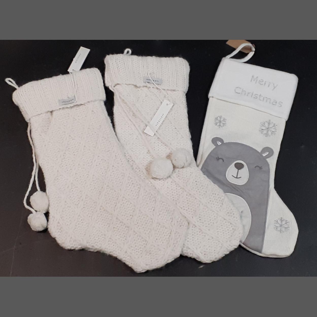 XMAS GIFTING IDEAS! - A pair of white RETREAT knitted stockings with pompoms and a HEAVEN SENDS Merry Christmas stocking. RRP £65