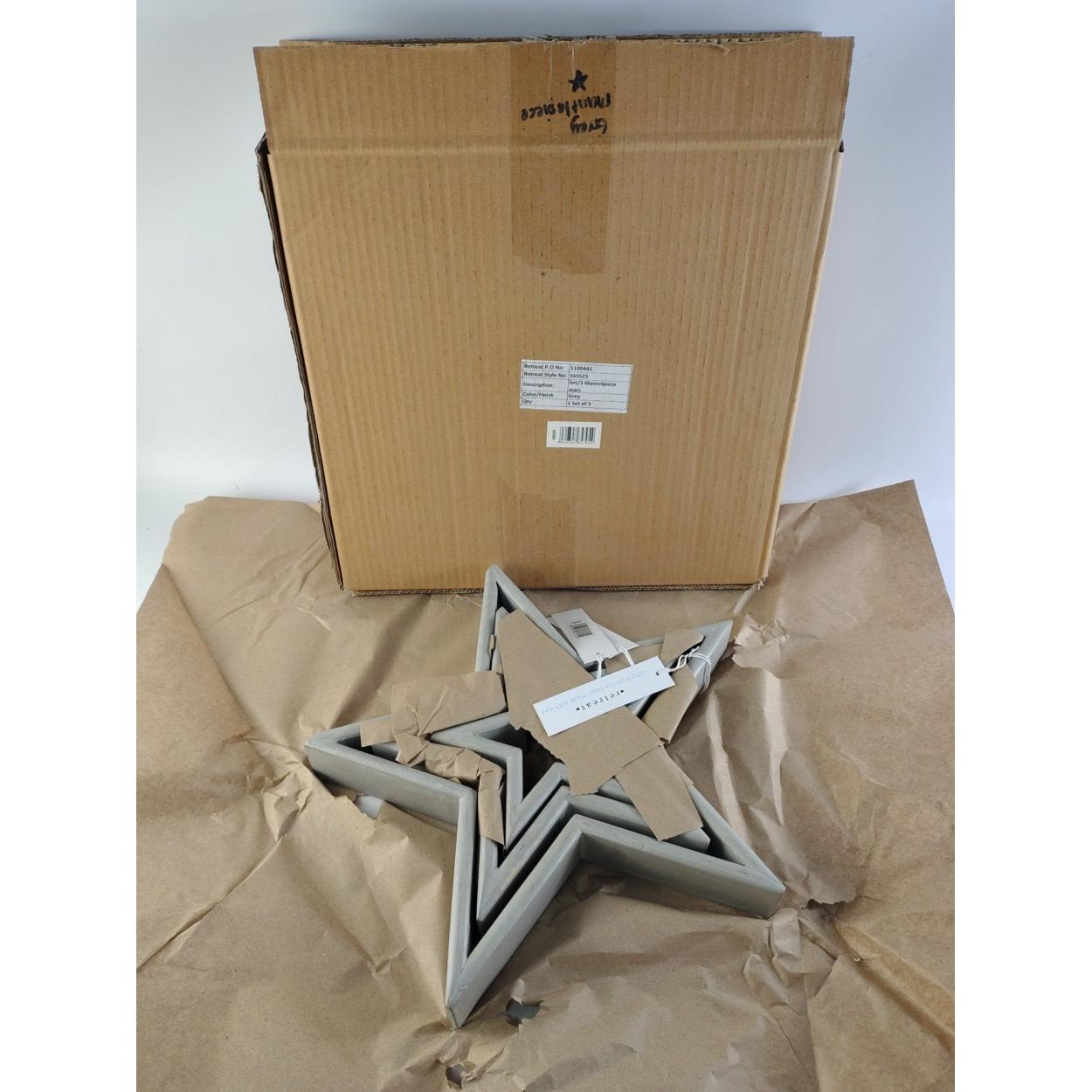 A set of three RETREAT nested decorative wooden grey mantelpiece stars, the largest 33cm across