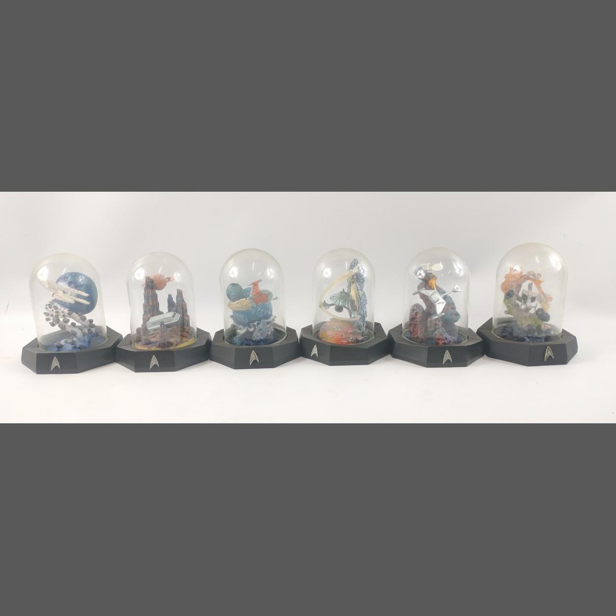 Six STAR TREK sculptures in glass domes produced by the Franklin Mint to include ' USS Enterprise', 'Romulan Bird of Prey' (some damage, 'Space station K-7', 'Klingon Encounter', 'SS Botany Bay', 'Galileo ll shuttlecraft', each model comes with its certificate of authenticity