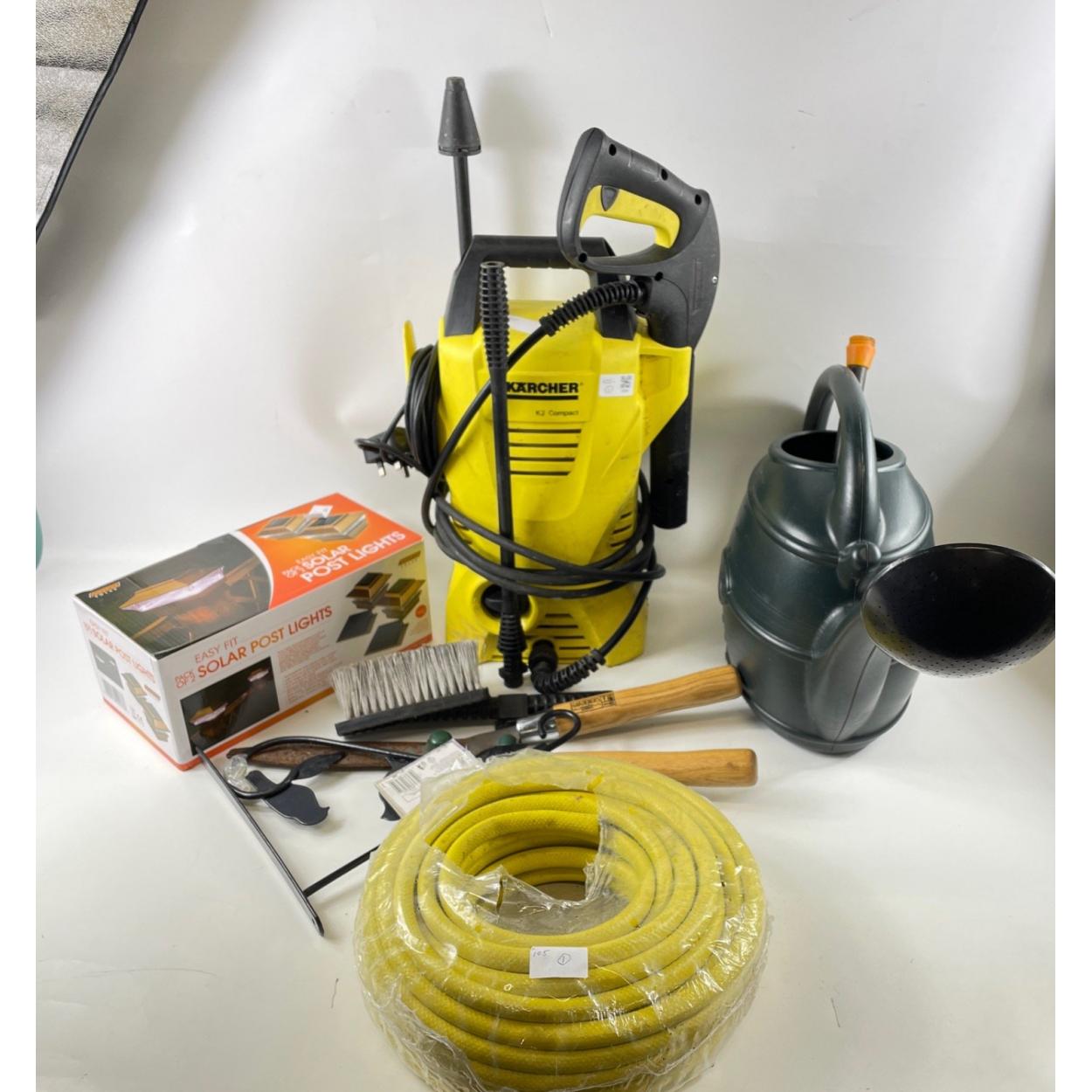Garden tools to include a Karcher K2 compact power spray, a 20m hose pipe and connector, 2 gal watering can, pair of gardening shears, and a 12" bird bracket and an unopened pack of 2 POWERTEK easyfit SOLAR POST LIGHTS