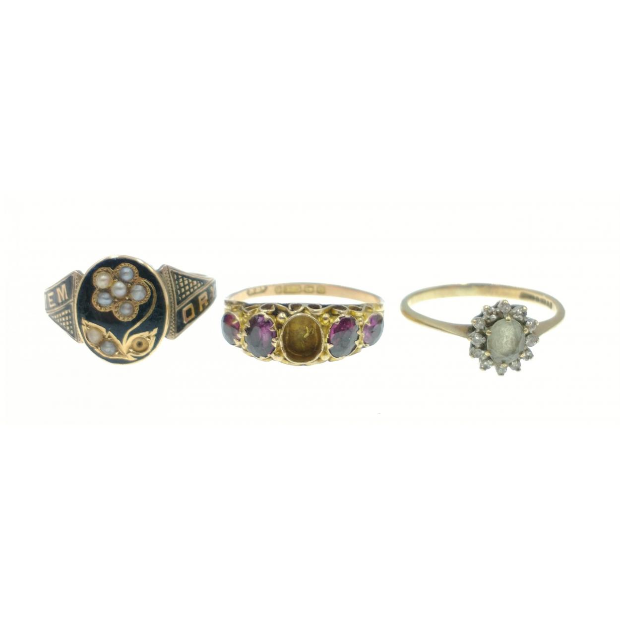 Three 9ct gold rings including a ring with a rosy quartz centre stone surrounded by 12 small chip diamonds (tested) size N, a vintage Memory ring missing one seed pearl size O and a ring with 4 amethysts (plus 1 missing ) size O/P, total gross weight 5.5g