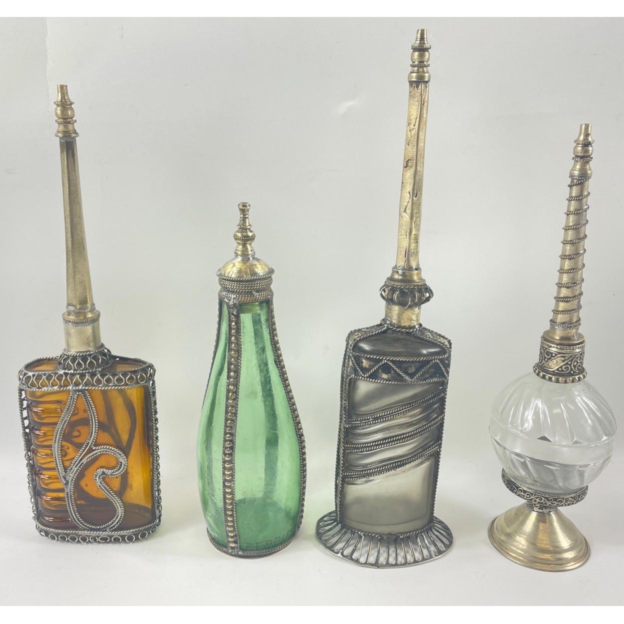 Four unusual upcycled DECORATIVE glass bottles each decorated with white metal trims, the tallest stands 28cm, the smallest (made from a Perrier water bottle) 20cm, the three bigger bottles each have a removable screw spike whilst the smallest has a pull-out stopper