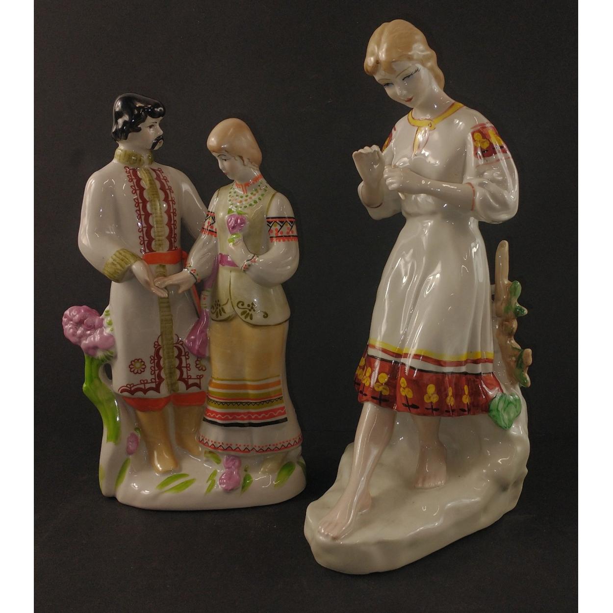 A china lot to include a vintage USSR POLONNE porcelain figurine of Ukrainian lovers standing 26cm tall, plus a vintage figurine of a Russian girl made by the Polonnoe ZHK porcelain factory standing 30cm tall