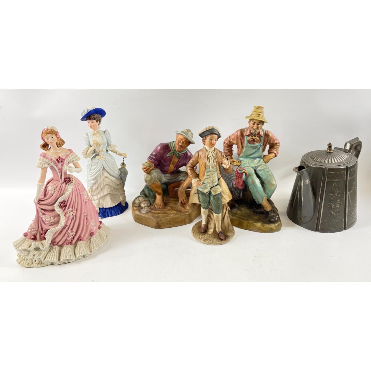 Two collectable over-sized ROYAL DOULTON figures to include 'Thanks Giving HN No 2446 and 'The Beachcomber' HN No 2487(shell slight damage repair on this one), largest figurine height 21cm approx with also two WEDGWOOD figurines 'The Coronation Ball' No 426 and 'Golden Jubilee' No 046 and two other unnamed figures with a VINTAGE EPBM teapot!