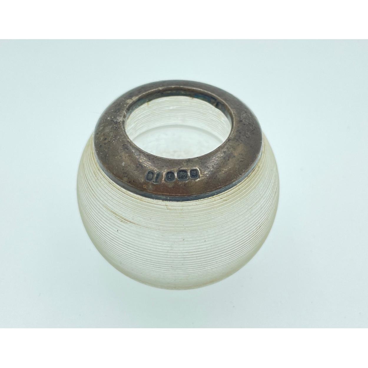 A lovely vintage wee glass inkwell with silver collar hallmarked Birmingham, date unclear, stands 5cm tall