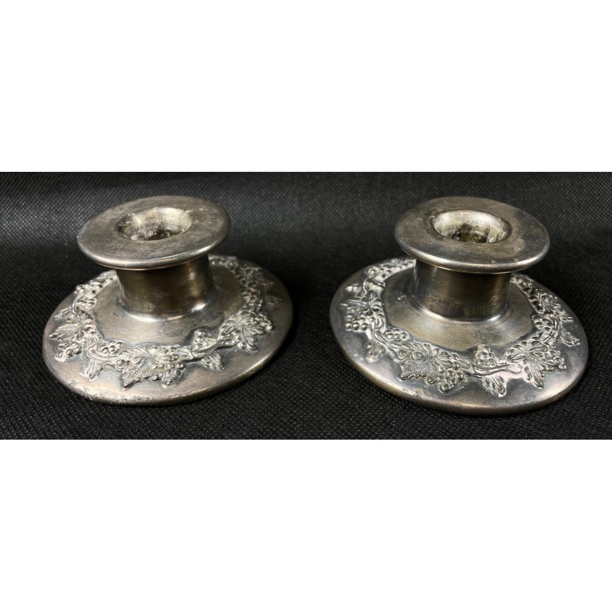A pair of 1881 ROGERS of CANADA EPNS candlesticks 5cm tall with pattern of grapes and vines
