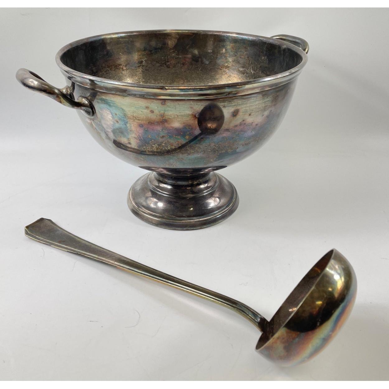 A BEAUTIFUL VINTAGE 'white metal' punch bowl and ladle - a fantastic statement piece for any dinner party! - dimensions 32cm diameter(incl the handles) x 18cm height approx - and a large stout 'white metal' serving ladle - dimensions 30cm length approx