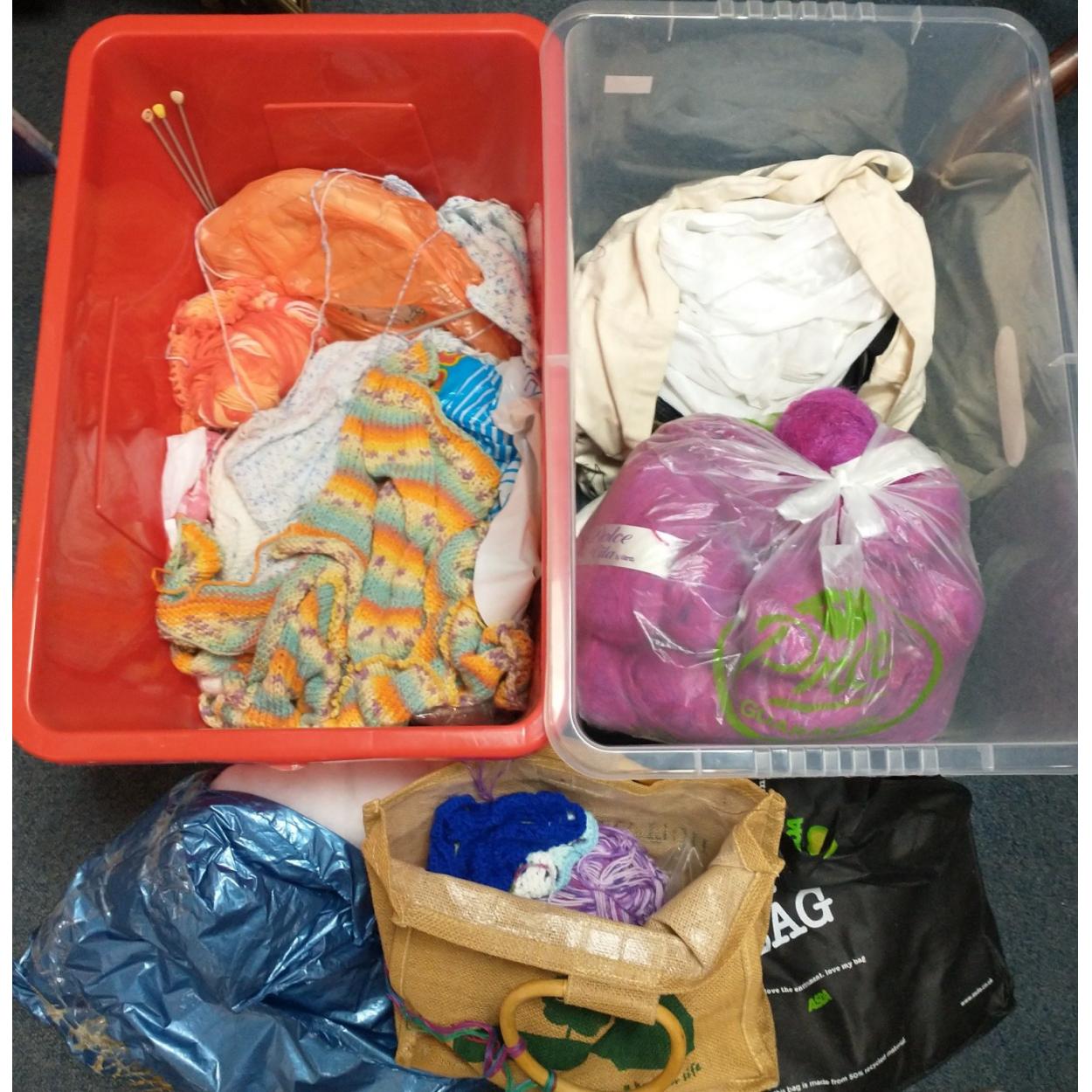 Two large plastic storage boxes complete with yarn from WENDY'S Serenity and Dolce Vita, cotton crochet yarn, as well as a part-worked tapestry kit and other part completed knitting projects