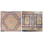 A BESPOKE quality padded reversible throw 240x240cm approx in shades of blue on one side and red and gold on the other with 2 matching pillow cases