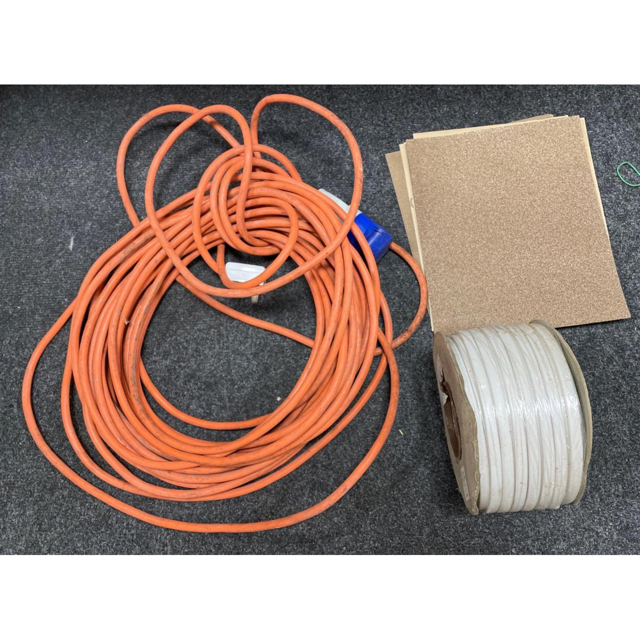 An outdoor heavyweight 250v extension cable plus a 50m reel of 1.0 6243Y cable plus a FLYMO mini strimmer with flex etc
