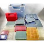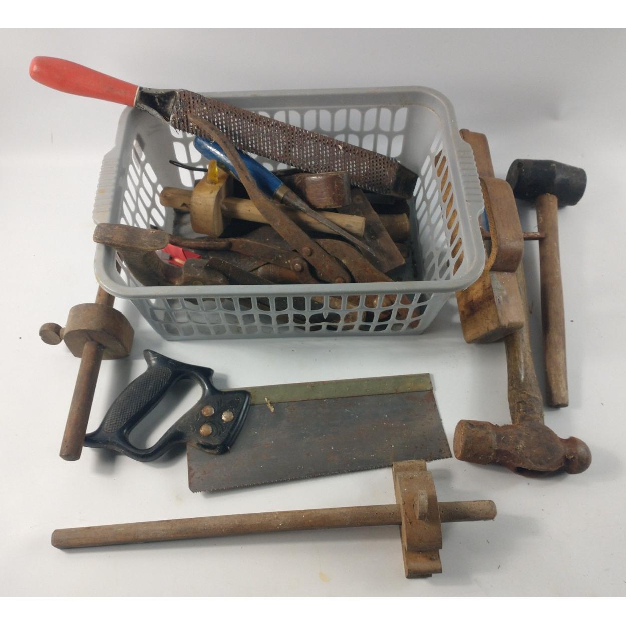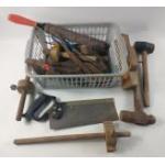A small box full of handyman tools including wooden-handled hammers and planes etc