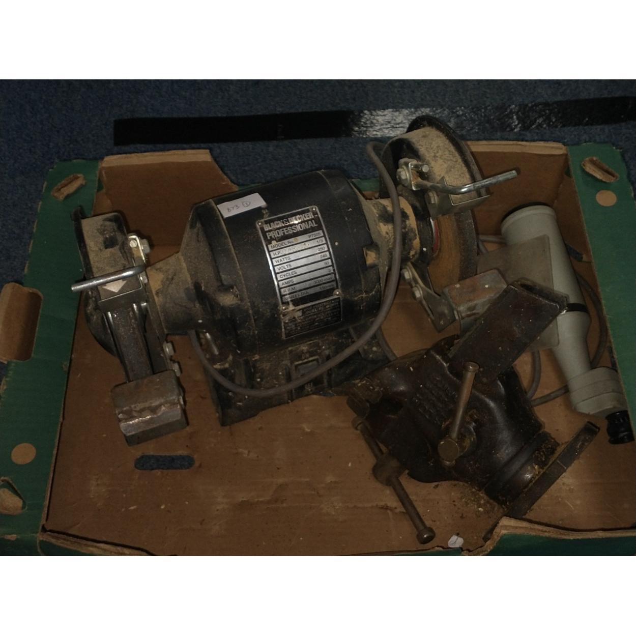 A mixed lot to include A SUBSTANTIAL BLACK AND DECKER twin ended bench grinder and a bench medium sized vintage vice