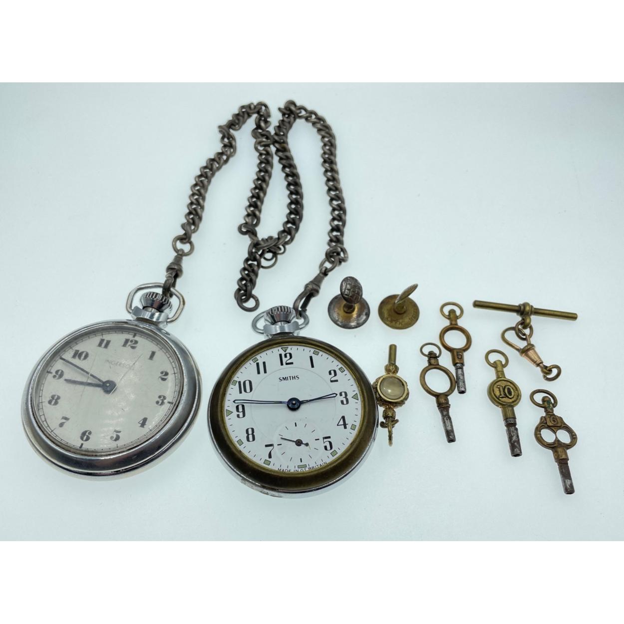 Two pocket watches, one by INGERSOLL (face 5cm), the other, minus the clock face, by SMITHS connected by a 375 watch chain approx 38cm gross weight 167g, plus a small box of 8 watch keys