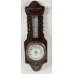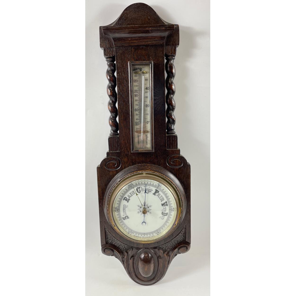 A dark wood with barley twist sides wall-mounted barometer and thermometer (bulb broken) measures 57x 19cm approx