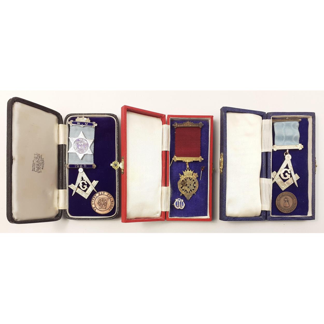 Three cased MASONIC jewels, 2 silver, to include Ravenhill Lodge 471, Worshipful Master 1969, Lodge 275 named with a 481 Belfast penny, and a bronze Temperance medal Belfast City