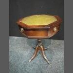An OCTAGONAL drum-style table with green leather top on 4 leg supports - 45cm diameter x 60cm height approx
