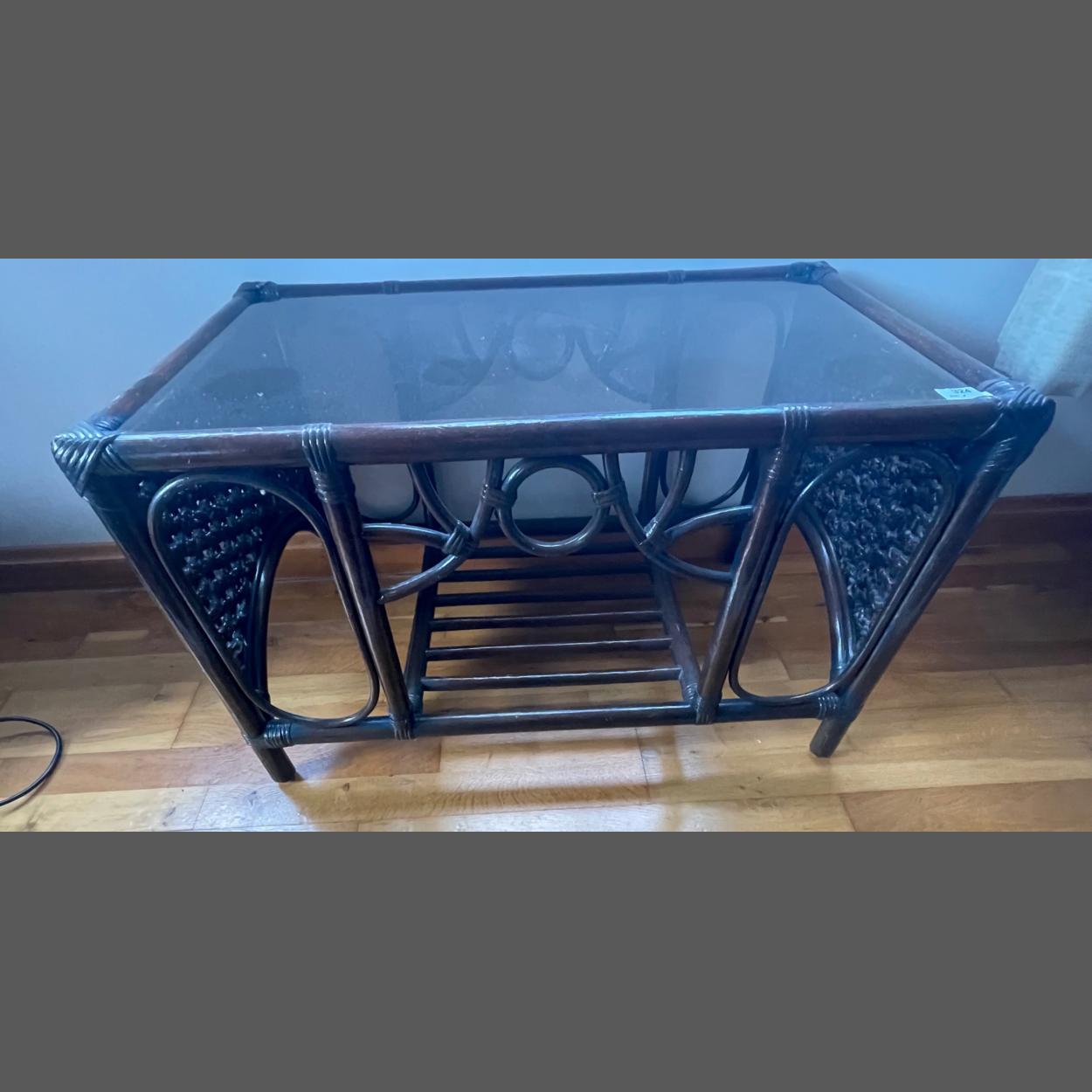 A STYLISH bamboo coffee table with glass top - nice condition - dimensions 3ft length x 18" depth x 18" height approx
