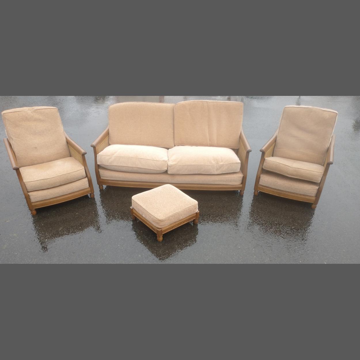 An ERCOL three piece suite comprising a three seater couch and two armchairs - with bergere sides and all in good condition and extremely