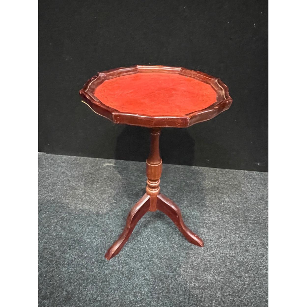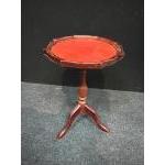 A nice wee wooden WINE TABLE with red leather style top on tri-pod support legs